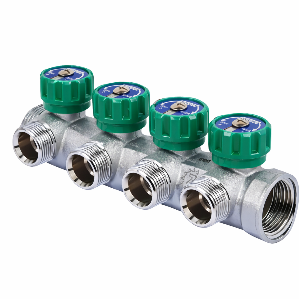 Модель оснащена четырьмя выходами 1/2" с подключением под плоскую прокладку и входом 3/4". Регулировочные вентильные механизмы обеспечивают точную настройку расхода по каждому потребителю и позволяют при необходимости полностью перекрыть отдельную линию.
