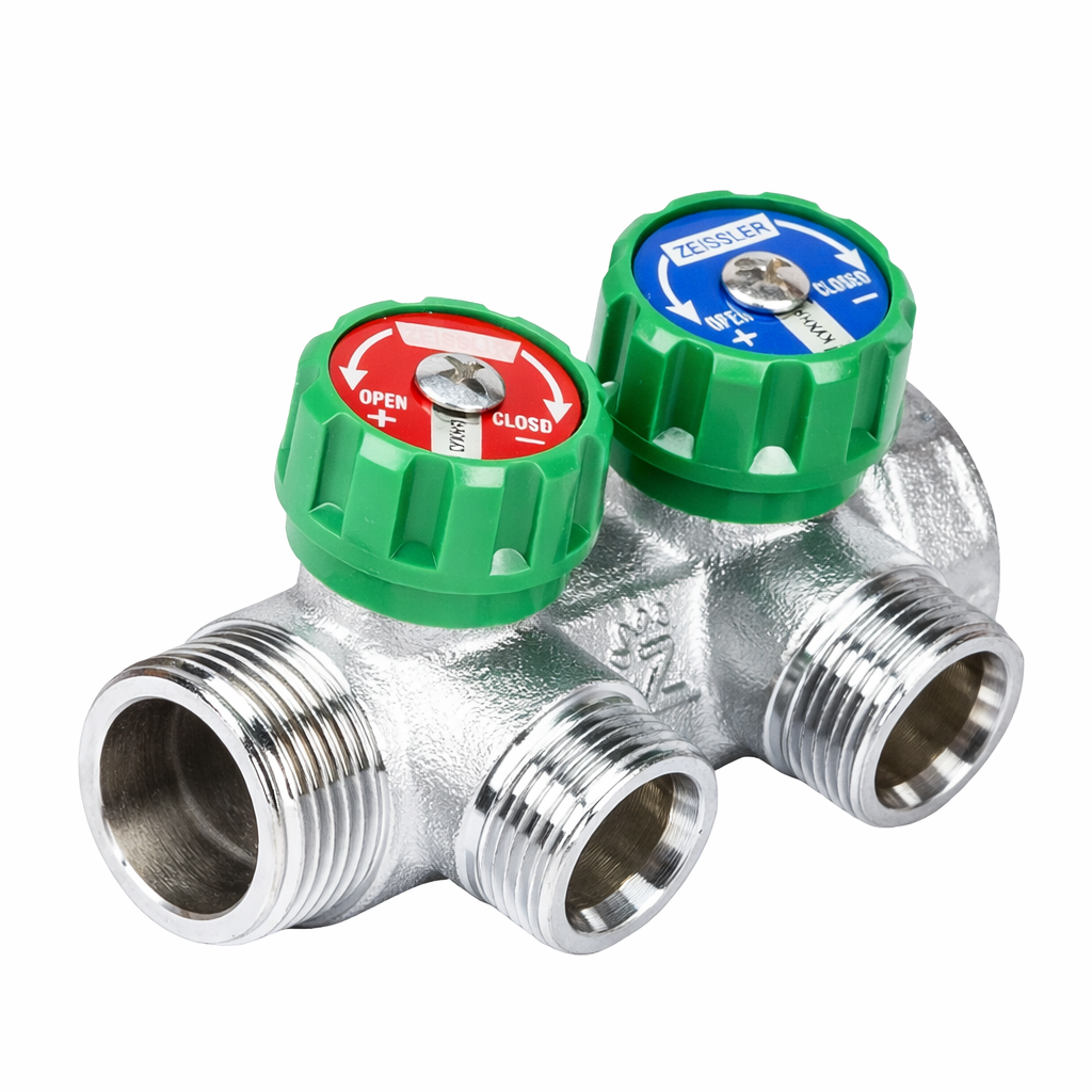 Коллектор с регулировочными вентилями 90 градусов 2 вых. 3/4 х 1/2 ZEISSLERКоллектор ZEISSLER предназначен для распределения и регулировки воды в системах холодного и горячего водоснабжения. Угловое исполнение 90 градусов обеспечивает удобный монтаж в коллекторных шкафах и при ограниченном пространстве.