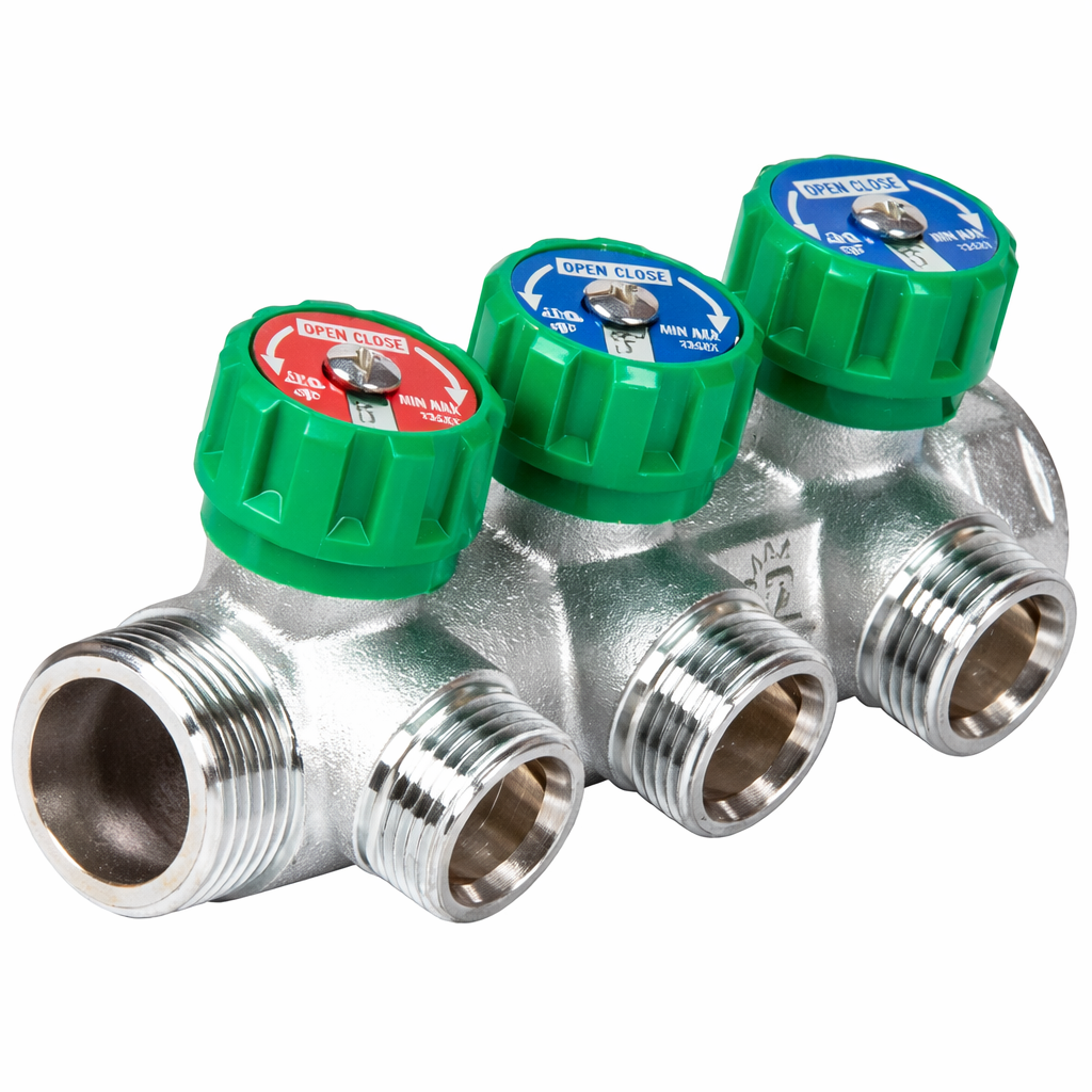Модель оснащена тремя выходами 3/4" Евроконус и входом 1". Регулировочные вентили позволяют точно настраивать расход по каждому контуру и при необходимости полностью перекрывать отдельную линию.