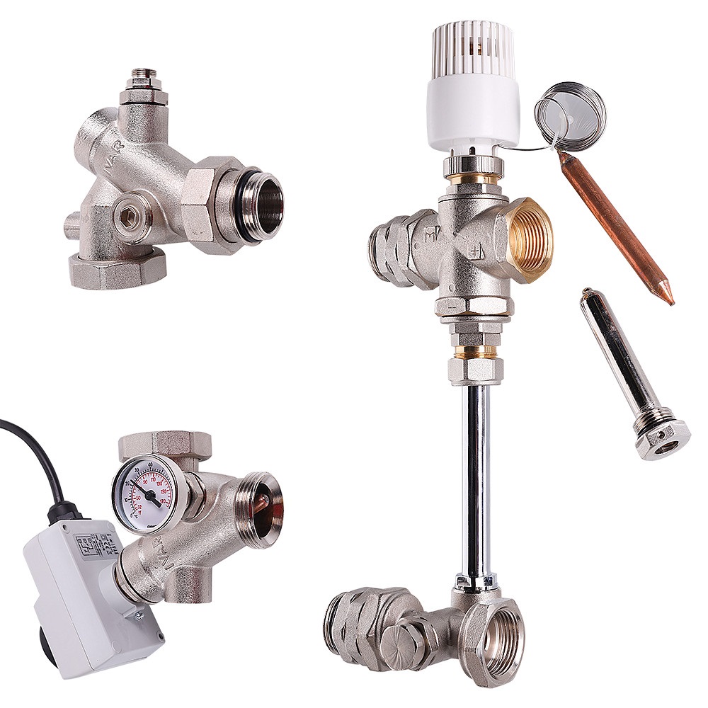 Насосно-смесительный узел для теплого пола VALTEC DUALMIX(VT.DUAL.0) Узел VALTEC DUALMIX состоит двух модулей – насосного и термостатического, между которыми монтируется коллекторный блок вторичного контура. Для смешения горячего теплоносителя с «обраткой» используется трехходовой клапан, управляемый термостатической головкой с выносным погружным датчиком. (При использовании контроллера отопления функция управления смесительным клапаном передается ему.) Другие основные элементы узла: перепускной байпас; балансировочный клапан; встроенные шаровые краны для отключения циркуляционного насоса; ручной воздухоотводчик; погружной термометр. Узел рассчитан на применение в системах отопления c водяным теплым полом при рабочем давлении до 10 бар и температуре теплоносителя в первичном контуре до 120 °С. Монтажная длина насоса (он приобретается отдельно) – 130 мм.