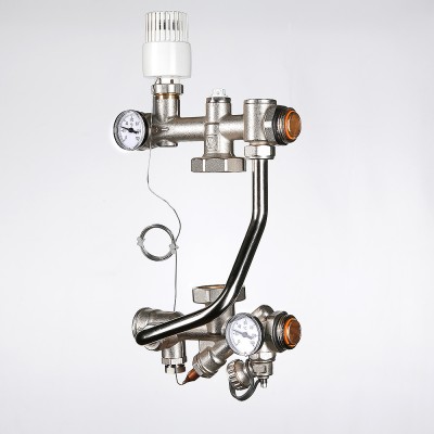 Узел адаптирован для совместного применения с распределительными коллекторами петель теплого пола при межцентровом расстоянии между коллекторами 200 мм. Поставляется без циркуляционного насоса.