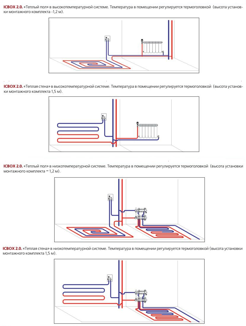 (VT.ICBOX.2) Терморегулирующие монтажные модули VT.ICBOX предназначены для создания водяного теплого пола на площадях до 15 кв. м, настенного водяного отопления или регулирования работы приборов водяного отопления. Комплекты VT.ICBOX позволяют подключать низкотемпературную систему к первичному контуру отопления без насосно-смесительного узла. При использовании модулей для регулирования работы отопительных приборов не требуется установка терморегуляторов непосредственно на радиаторах и конвекторах, повышается качество терморегулирования (отсутствует влияние конвективных потоков). VT.ICBOX-2 – комплект со встроенным автоматическим регулятором температуры теплоносителя и термостатическим клапаном, управляемым термоголовкой (устройства управления в комплект поставки не входят). Модуль рассчитан на применение в системах с номинальным давлением 10 бар и рабочей температурой до 90 °C.