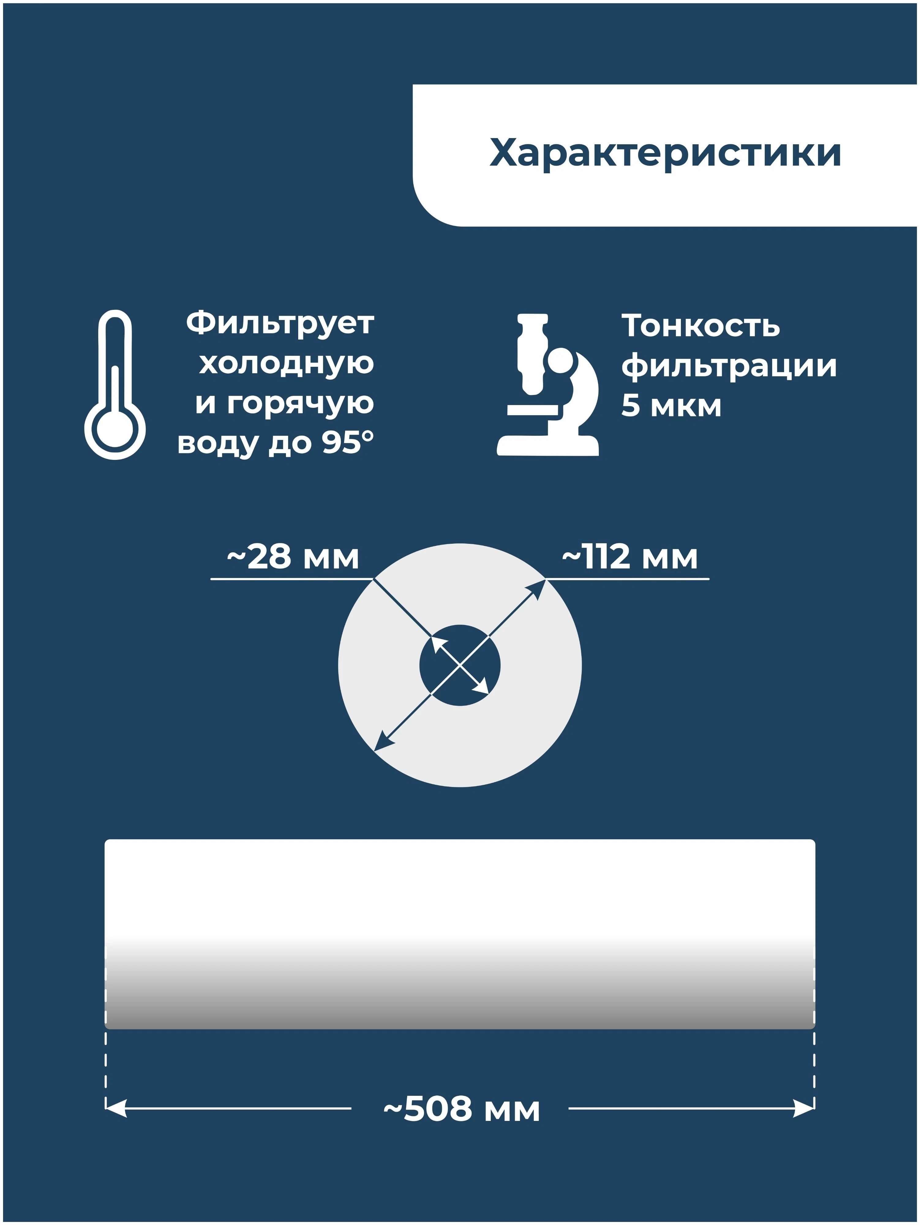 Полипропиленовый картридж изготовлен из пищевого синтетического материала, который не меняет цвет и состав воды. Он может очищать как холодную, так и горячую воду. Это универсальный и практичный продукт.