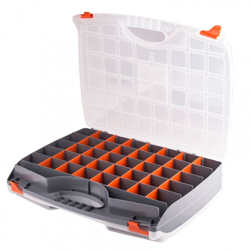 Большой и удобный органайзер с множеством отделений различного размера.Выполнен из прочного пластика.