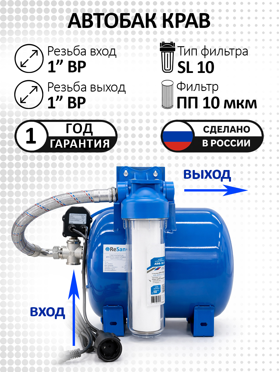 Комплексное решение автоматизации водоснабжения (КРАВ) — это готовый к установке узел для автоматического управления насосом и защиты системы водоснабжения в частном доме, на даче или хозяйственных объектах.Гидроаккумулятор в сборе с автоматикой КРАВ 100 л объединяет электронное реле давления РДЭ, гидробак и защитные элементы в одном корпусе, обеспечивая стабильное давление воды и надёжную работу насосного оборудования.