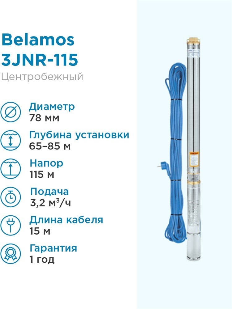 ?? Скважинный погружной насос Belamos 3JNR - 115/3 разработан для высокоэффективной подачи чистой воды с большой глубины в жилищные объекты и для орошения сада. Устанавливается прямо в пробуренные скважины и применяется в автоматических системах водоснабжения дач, частных домов, коттеджей и других построек, не имеющих возможности подключения к центральной системе водоснабжения.?? Преимущества: