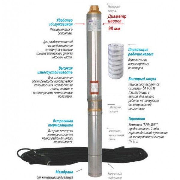 ?? Скважинный погружной насос Belamos TF-40 разработан для высокоэффективной подачи чистой воды с большой глубины в жилищные объекты и для орошения сада. Устанавливается прямо в пробуренные скважины и применяется в автоматических системах водоснабжения дач, частных домов, коттеджей и других построек, не имеющих возможности подключения к центральной системе водоснабжения.?? Преимущества: