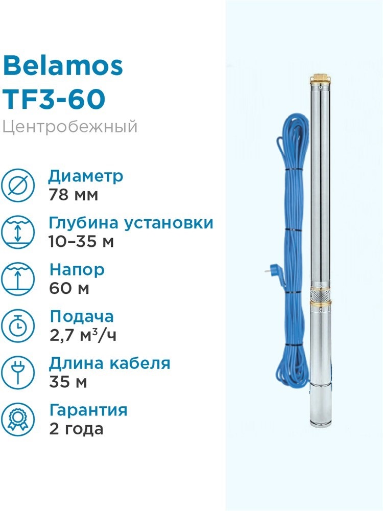 ?? Скважинный погружной насос Belamos TF3-60 разработан для высокоэффективной подачи чистой воды с большой глубины в жилищные объекты и для орошения сада. Устанавливается прямо в пробуренные скважины и применяется в автоматических системах водоснабжения дач, частных домов, коттеджей и других построек, не имеющих возможности подключения к центральной системе водоснабжения.?? Преимущества: