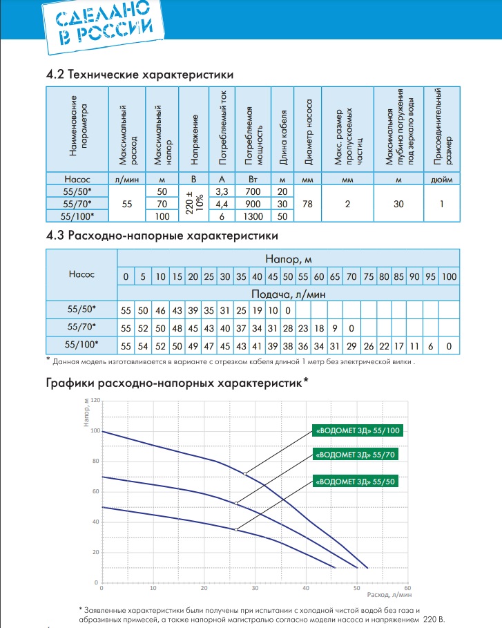 Насос скважинный погружной центробежный ВОДОМЕТ «3Д» 55/100 (78 мм, 220В, 1300Вт, 55 л/мин, 100м) кабель 50 м ДЖИЛЕКС