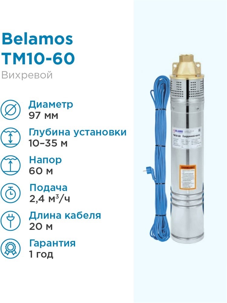 Насос скважинный погружной вихревой ТМ10-60 (4", 1100Вт, 2400л/ч, 60м) кабель 20м (до 30м) BELAMOS