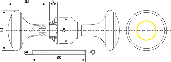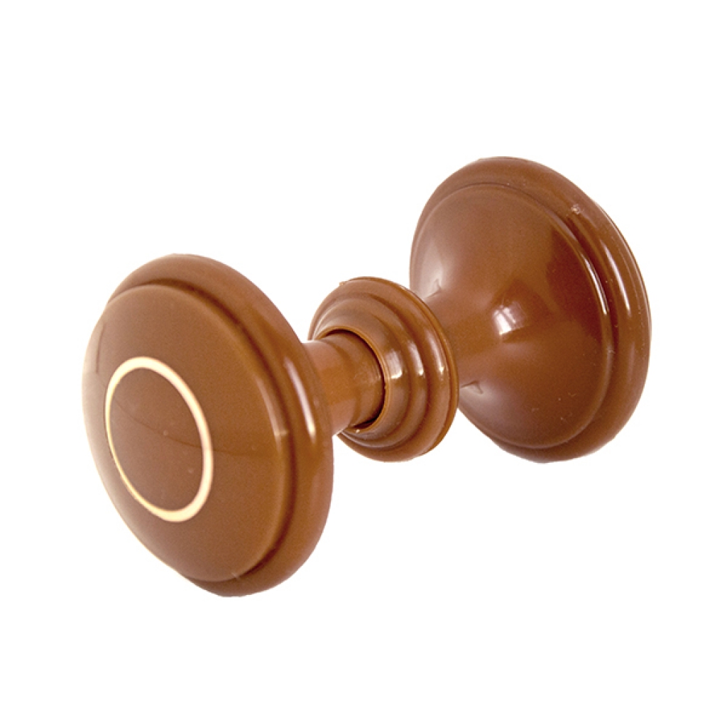 Ручка-кнопка дверная. Материал - пластик. Диаметр ручки - 65 мм, высота ручки - 65 мм. В комплекте соединительный штырь-винт длиной 100 мм. В центре ручки окантовка в виде золотого кольца.