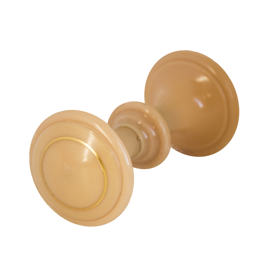 Ручка-кнопка дверная. Материал - пластик. В комплекте соединительный штырь-винт длиной 100 мм. В центре ручки окантовка в виде золотого кольца.Характеристики