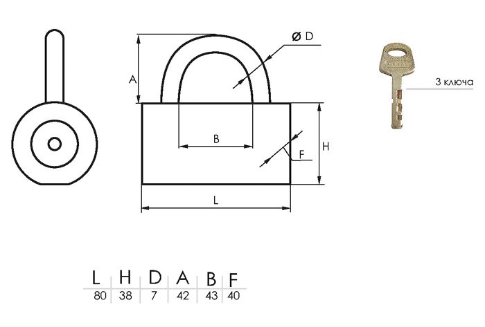 Замок навесной используется для запирания помещений. Материал корпуса - сплав, дужка - закаленная сталь. Запирание с помощью ключа. Простой и надежный в эксплуатации.Отзывы