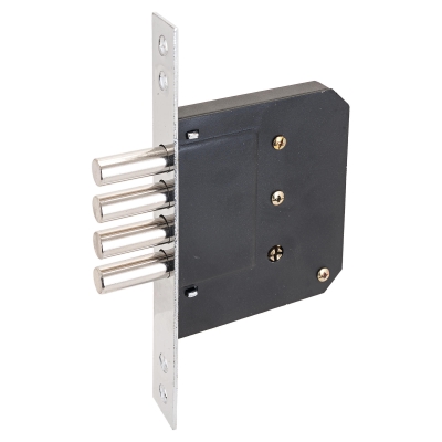 Замок врезной цилиндровый, под крестообразный ключ. Предназначен для установки в деревянные двери, металлические ящики, кабинки и пр.Корпус - стальной покрыт полимерной краской, засов из четырех стальных цилиндрических ригелей, диаметром 12мм. Удаление ключевого отверстия 50мм. 5 ключей. Ширина торцевой планки 23мм, гальваническое покрытие, цвет - хром.