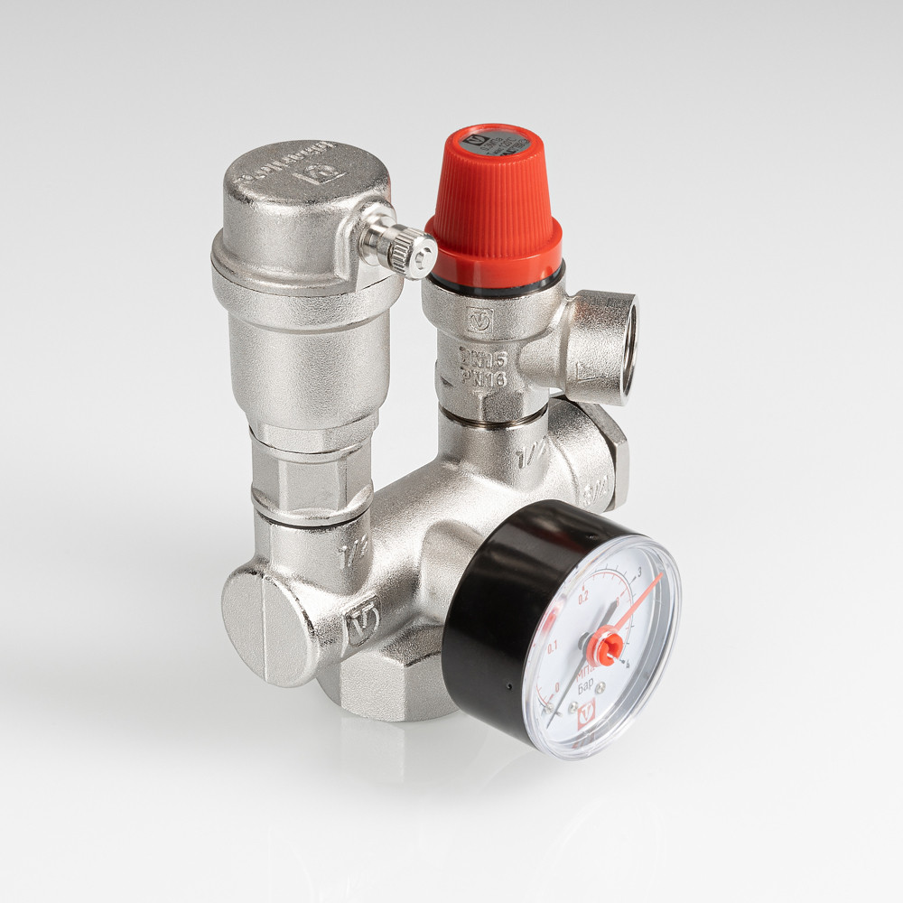 Состав изделия: предохранительный клапан (настройка – фиксированная, 3 бара), автоматический воздухоотводчик, манометр со шкалой 0–4 бар, латунный никелированный корпус.