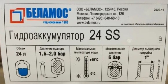 ? В комплект поставки входит: гидропневматический бак объемом 24 л; инструкция по монтажу и эксплуатации.