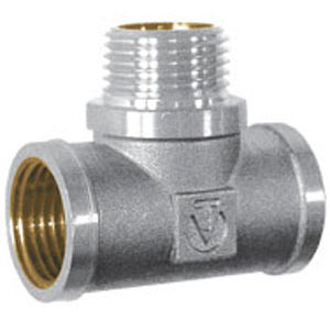 Латунный никелированный трехсторонний резьбовой фитинг, равнопроходной.Резьба – внутренняя/наружная/внутренняя, цилиндрическая трубная по ГОСТу 6357 (ISO 228, EN 10226).