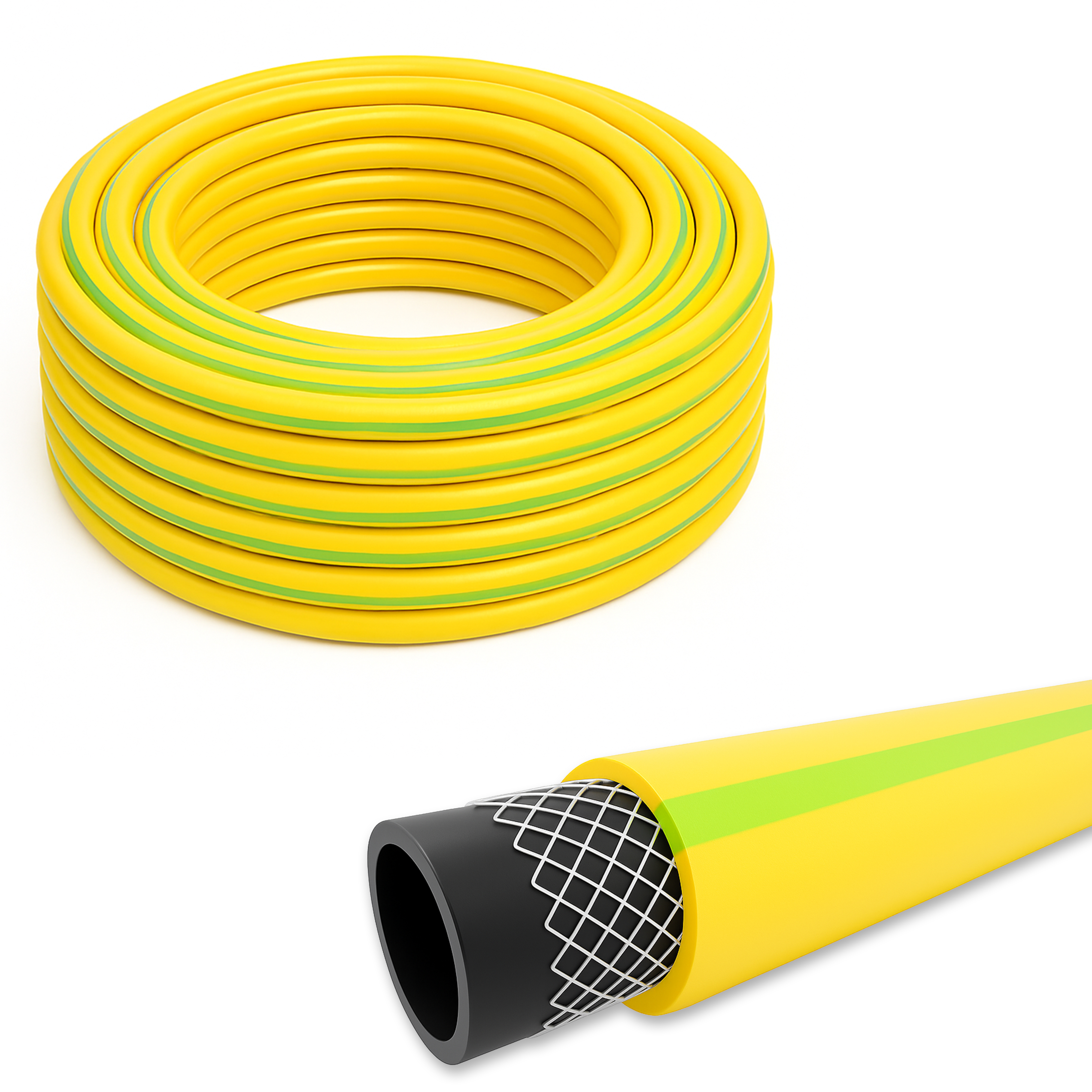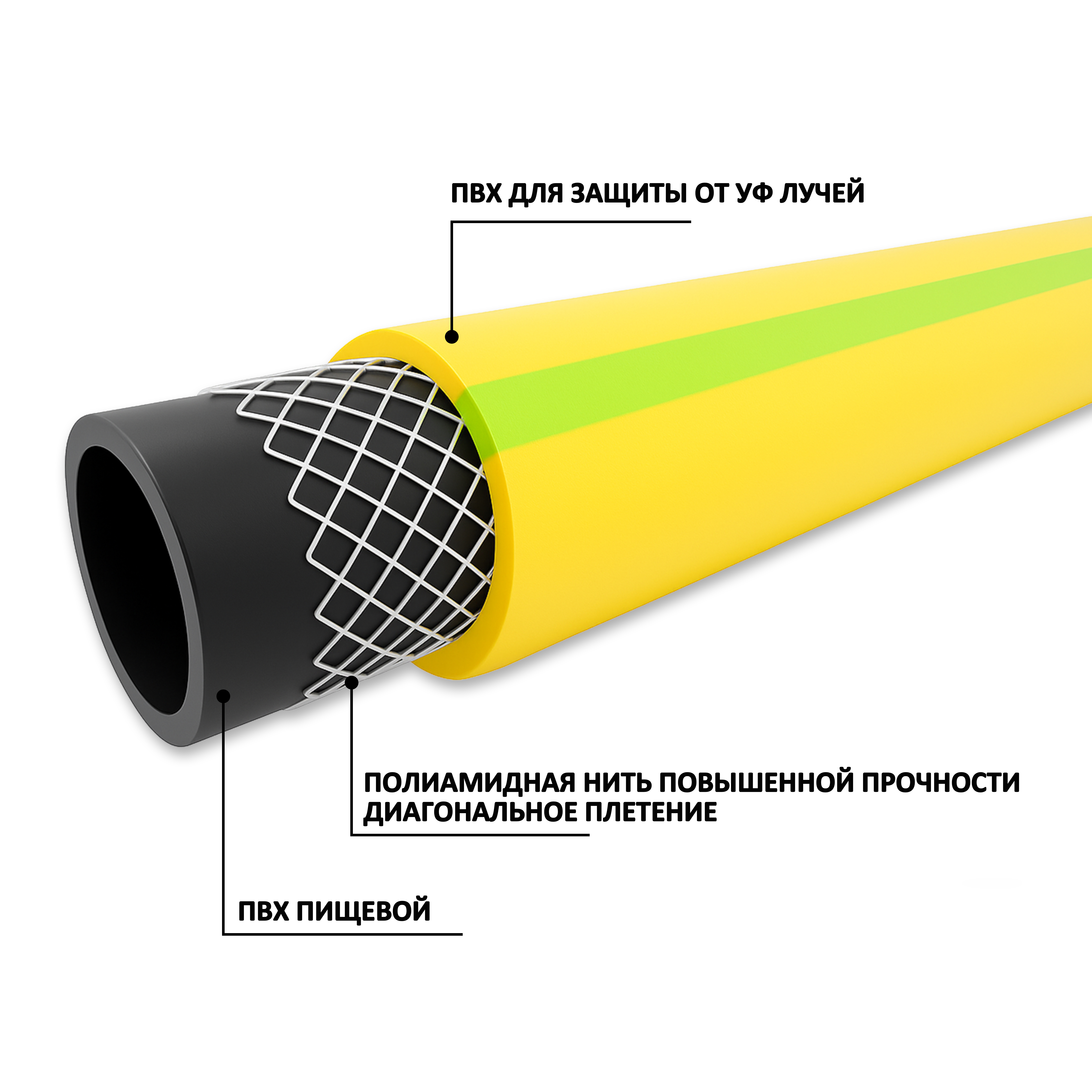 Структура и внешний вид: внутренний слой не прозрачный черный, армирующая нить, не прозрачный желтый, полоса зеленого цвета.Особенность: шланг обладает более низкой степенью мягкости и пластичности, благодаря этому шланг совсем не скручивается и не заламывается.