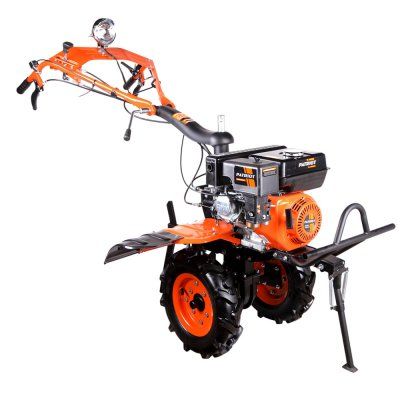 Мощный мотоблок с многодисковым сцеплением в масляной ванне и шестеренчатым редуктором укомплектован фрезами и пневматическими колесами, что позволяет использовать мотоблок для культивирования, сразу "из коробки". Ножи на фрезах имеют усиленную "серповидную" конструкцию с измененной геометрией по длине ножа, такая форма специально разработана для работы по различным почвам и используется в почвофрезах на тракторах. Универсальный узел сцепки — самый распространённый и дает возможность устанавливать разнообразное навесное оборудование: плуги и окучники различной конфигурации. Тележка для мотоблоков подходит практически любая, а если и понадобится переделка, то она будет минимальна и ее можно произвести без обращения в сервисный центр. Наличие регулируемой фары на руле позволит использовать мотоблок в темное время суток. Отдельно можете приобрести и установить роторную косилку, помпу, тележку, плуг, окучник, картофелевыкапыватель, а если установить гусеничную приставку, то получится мотобуксировщик для движения по глубокому снегу и бездорожью.Наличие