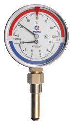 Термоманометр — комбинированный прибор, для измерения давления и температуры. Для визуального контроля основных параметров теплоносителя (давления и температуры) как правило, применяют манометр и термометр. Попытка объединить эти два прибора привела к созданию комбинированного прибора, получившего название «термоманометр».Конструктивно термоманометр ТМТБ объединяет деформационный манометр и биметаллический термометр. Темоманометры имеют циферблат с двумя шкалами и две указательных стрелки. Одна шкала служит для отсчета давления, другая — температуры. Компания «РОСМА» выпускает термоманометры двух типоразмеров: диаметром корпуса 80 и 100 мм. По расположению штуцера термоманометры могут быть осевыми и радиальными. Длина погружной части также может варьироваться по заказу потребителя. Все термоманометры комплектуются защитным клапаном. Клапан это запорное устройство, которое служит с одной стороны для удобства монтажа прибора, с другой выполняет роль крана, что позволяет демонтировать термоманометр без слива системы (или без остановки технологического процесса). Рабочее давление клапана 2,5 МПа, максимальное — 5 МПа. По диапазонам температур термоманометры выпускаются в двух вариантах от 0–120°С и до 160°С, а по давлению 0–0,25 МПа, 0–0,4 МПа, 0–0,6 МПа…0–2,5 МПа. К сожалению, технические службы потребителя часто делают ошибку, устанавливая расширитель или дополнительный отвод для монтажа термоманометра. Следует помнить, что для измерения температуры в приборе, в качестве чувствительного элемента, применяется биметаллическая пружина и поэтому погружная часть термоманометра должна находиться в трубе (в непосредственном контакте с теплоносителем), иначе возникает большая погрешность при измерении температуры. Погрешность измерения температуры минимальна, если конец клапана погружен на глубину не менее 1/3 и не более 2/3 диаметра трубопровода. Термоманометры монтируются непосредственно на трубопровод, достаточно к нему приварить бобышку с внутренней резьбой G?.