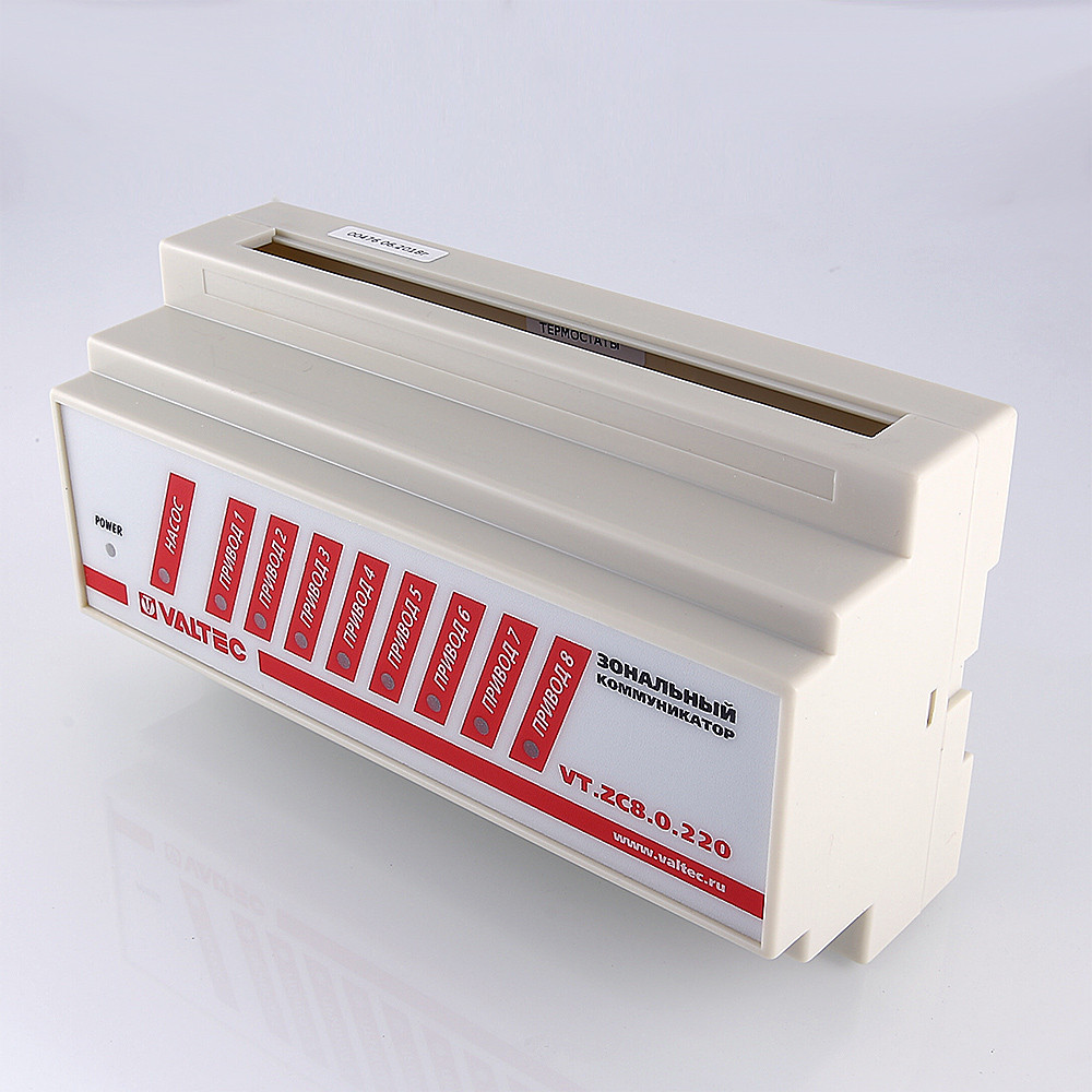 Зональный коммуникатор VT.ZC8 служит для передачи сигналов (вкл./выкл.) от комнатных термостатов на сервоприводы термостатических клапанов, управляющих подачей теплоносителя по контурам системы отопления.Применение коммуникатора упрощает схему управления, позволяет объединять термостаты и сервоприводы в группы (сервоприводы группы включаются по сигналу одного термостата).