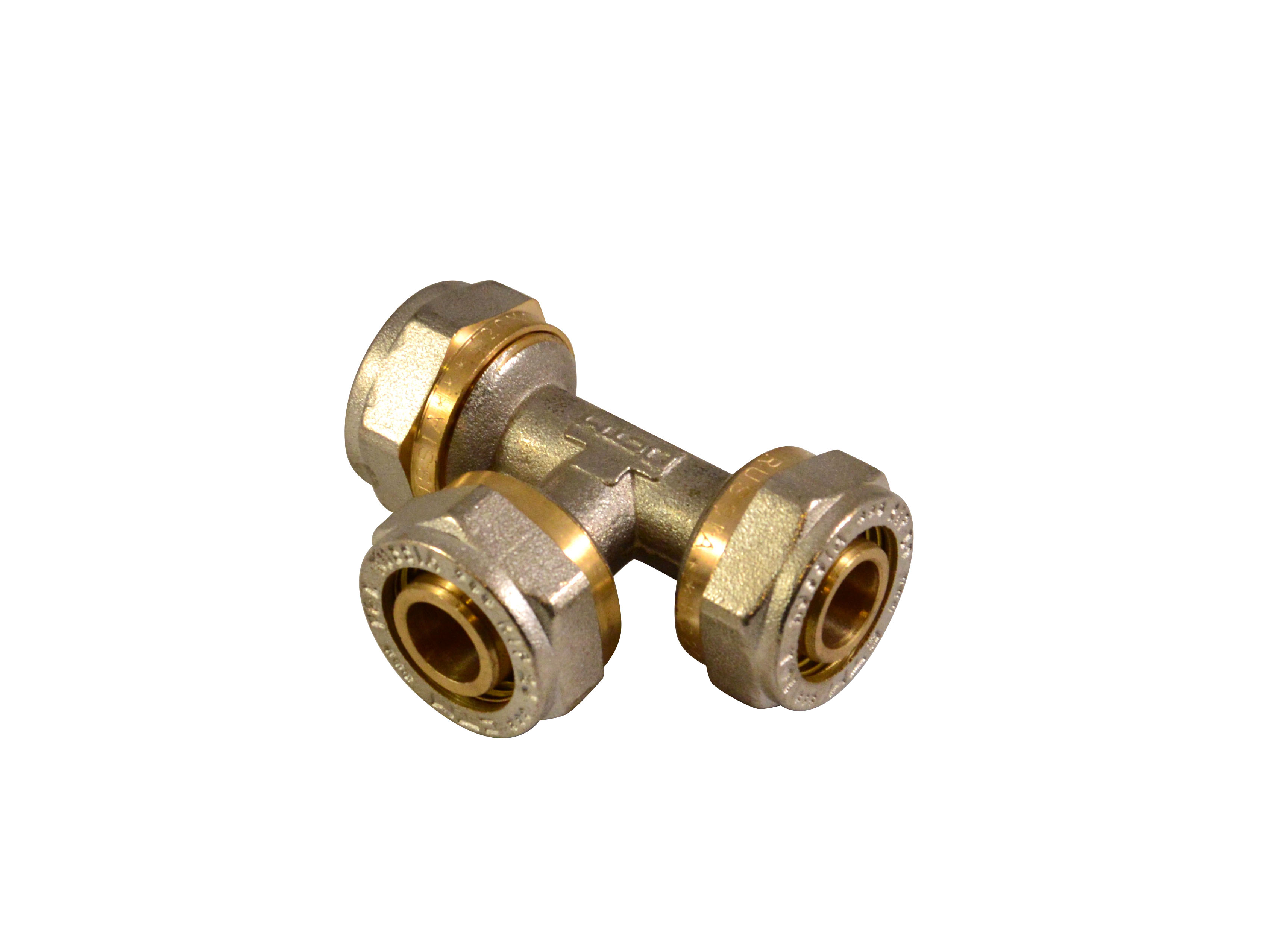 Тройник 20х20х20 CTM - обжимной фитинг для соединения металлопластиковых (металлополимерных) труб. Изготовлен методом горячей штамповки из латуни с последующей термической обработкой и никелированием для предотвращения появления коррозии, механического износа и вредного воздействия агрессивных жидкостей и воздушно-газовых сред. Корпус, накидные гайки и обжимные кольца тройника изготовлены из латуни , уплотнительное кольцо из нетоксичной резины (EPDM), и диэлектрическая прокладка из фторопласта Ф4. Накидные гайки – усиленные.Материал: латунь с никелированным покрытием