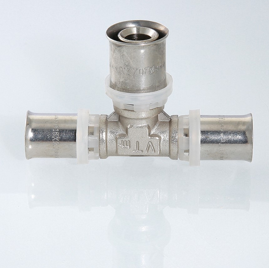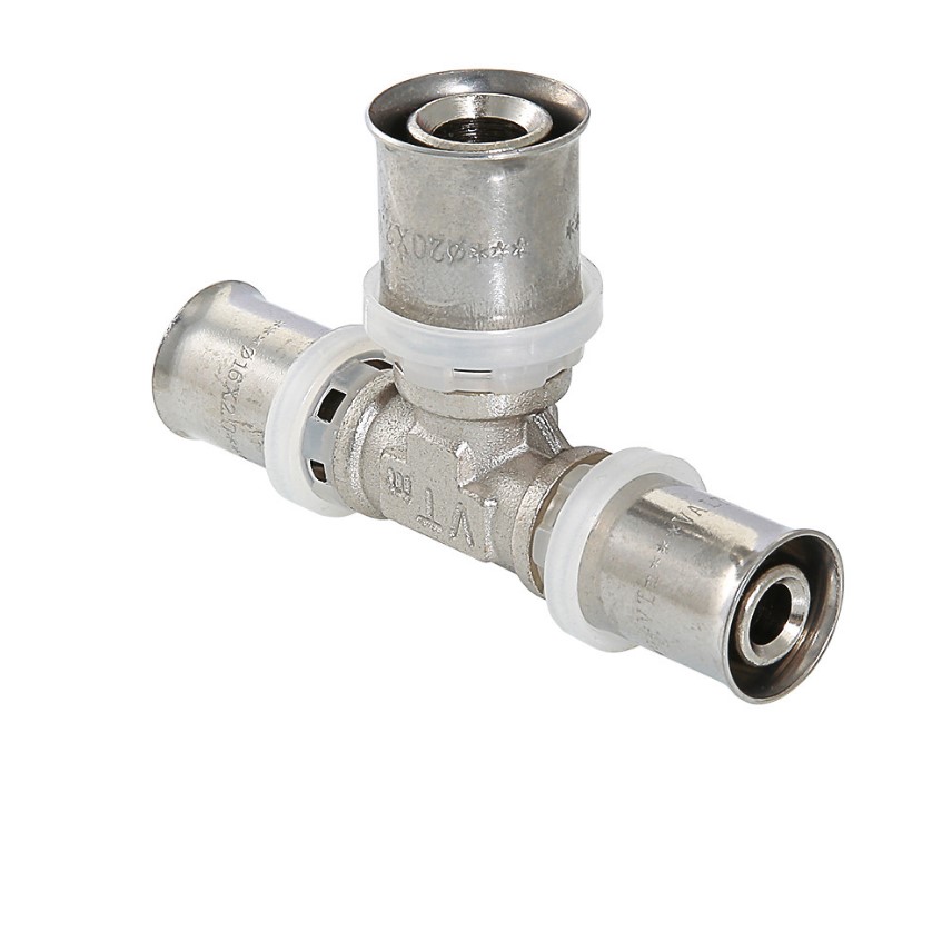 Тройник пресс VTm(VTm.231.N) Пресс-фитинг – тройник предназначен для соединения трех труб – металлопластиковых либо из сшитого полиэтилена. Корпус выполнен из сантехнической латуни марки CW617N, уплотнительные кольца штуцеров – из EPDM плотностью 1,22 г/см3, пресс-гильзы – из нержавеющей стали. Нейлоновая обойма выполняет функции фиксатора гильзы, направляющей для пресс-насадок и диэлектрической прокладки, прерывающей контакт между алюминием трубы и латунью корпуса. Конструкция пресс-фитингов VALTEC обеспечивает повышенную пропускную способность, надежность соединений, прочность и термостойкость. Монтаж фитинга производится пресс-инструментом с насадкой «ТН». Типоряд содержит равнопроходные и переходные пресс-тройники.