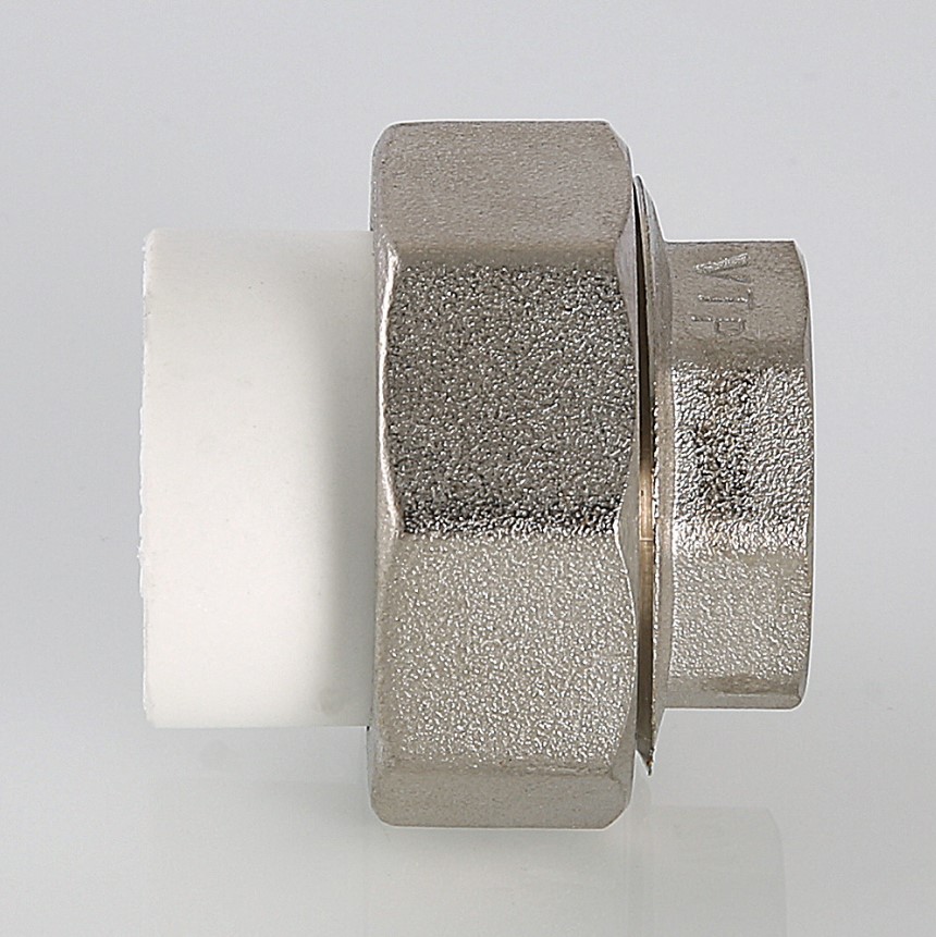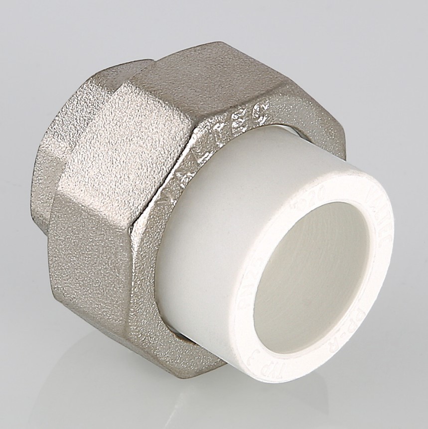 Разъемный полипропиленовый фитинг с переходом на внутреннюю резьбу(VTp.762.0) Металлопластиковый фитинг для создания разъемного, с использованием накидной гайки, соединения полипропиленового трубопровода с трубопроводом или арматурой из других материалов. Уплотнительное кольцо выполнено из синтетического каучука EPDM. Резьба фитинга – внутренняя трубная по ГОСТу 6357.