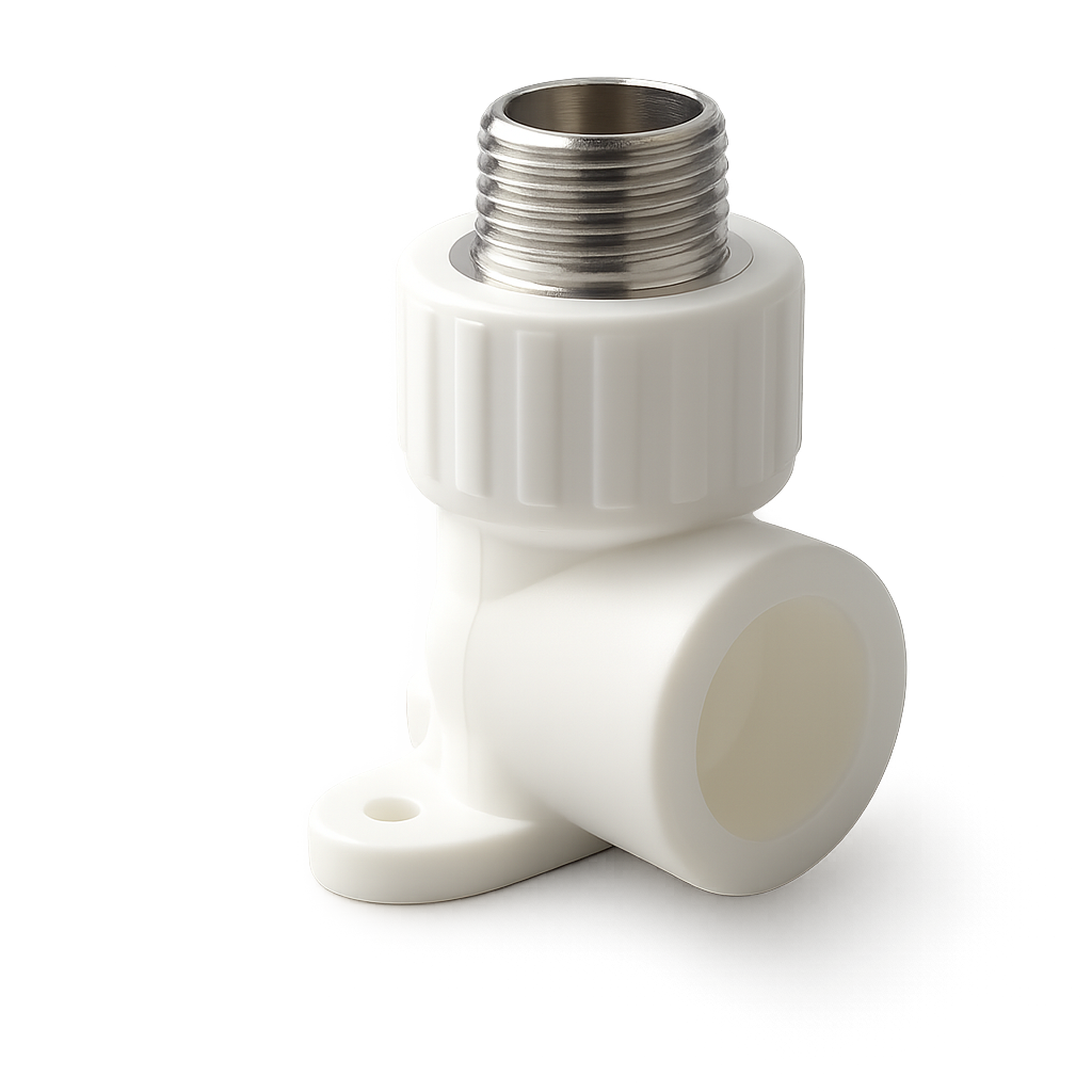 Угольник с наружней резьбой и креплением используется для соединения под углом 90о иОдновременного крепления к вертикальной плоскости трубы PPR с резьбовым фитингом с наружной резьбой.